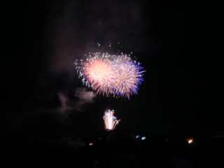 | 花火は21時からです。くるまやさんの展望広場がまた登場です。いつもは山を向けてセットされているベンチが今夜は反対を向けてセットしてくれていました。ココで見る花火は最高!誰も居ないし、真正面に大きく見えるしすずしいし!こんな花火大会は初めてです。いいねぇ!白馬の夏!旅の最後の夜空を美しい花火が飾ってくれました。 |