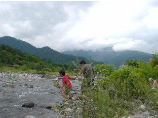 | 昼からは白馬の平川という川で川遊びです。とっても透明で冷たい川で、魚も見当たりません。いっぱい網を買っていったのに! |